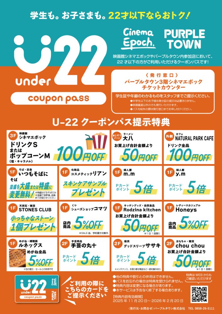 学生も。お子さまも。 パープルタウンは22才以下のみなさんを応援します! 22才以下ならどなたでもおトクなサービスを受けられますので、ぜひこの機会にU-22クーポンパスをご利用ください。 詳しくはこちらのページをご覧くだ […]