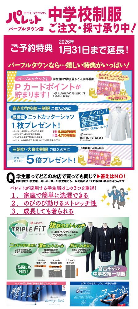 パレットではただいま倉吉市内中学校をはじめとした、中学校学生服の最終ご注文承り中です!