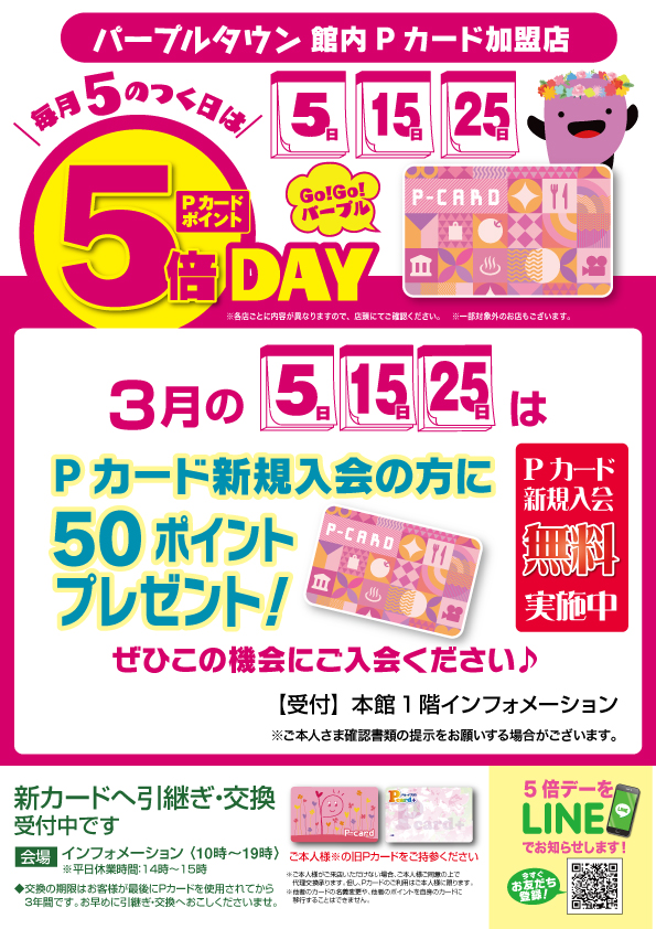 毎月5のつく日はPカードポイント5倍DAY 5・15・25日はPカード新規入会の方に50ポイントプレゼント!