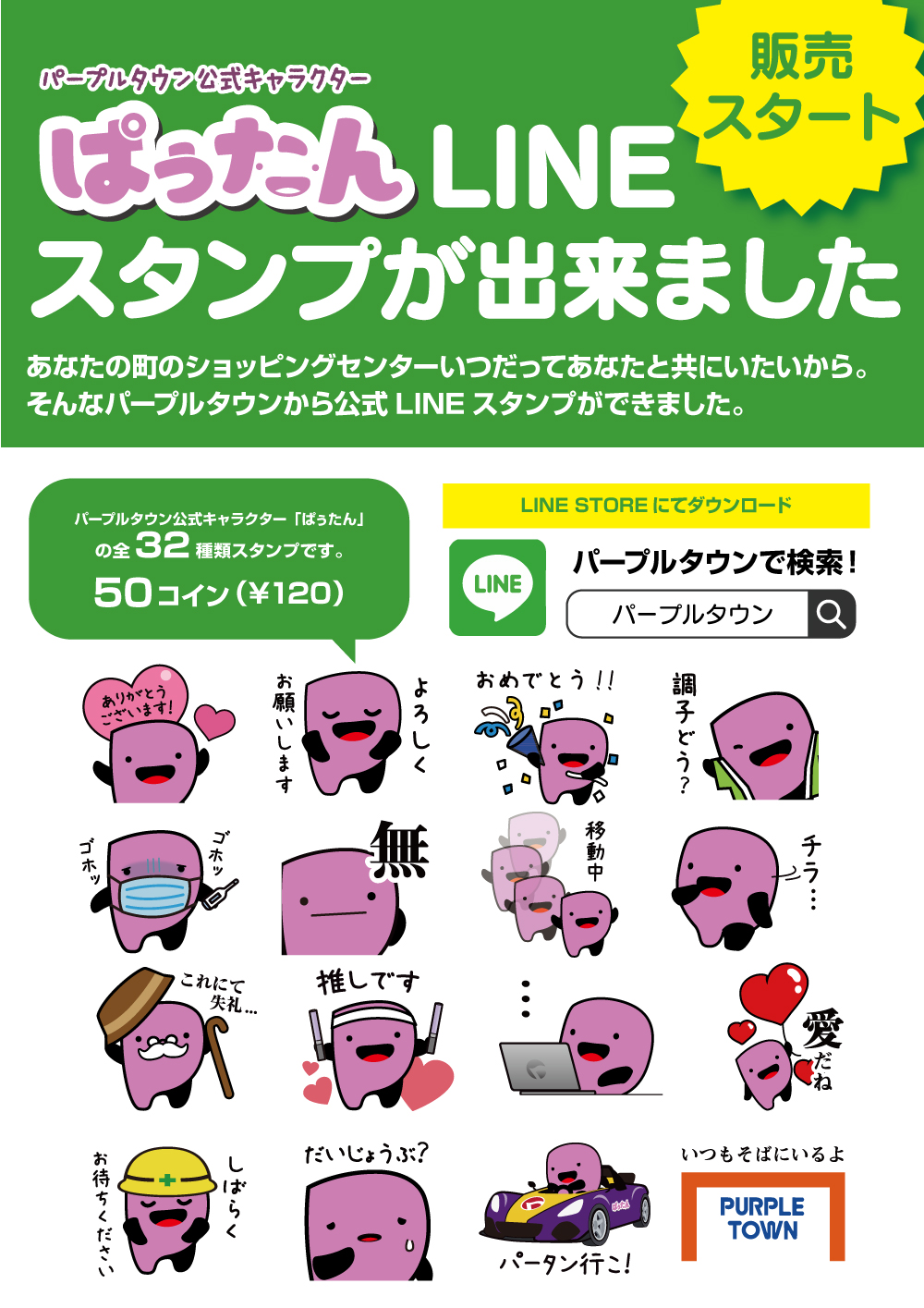 パープルタウン公式キャラクター「ぱぅたん」の全32種類スタンプ