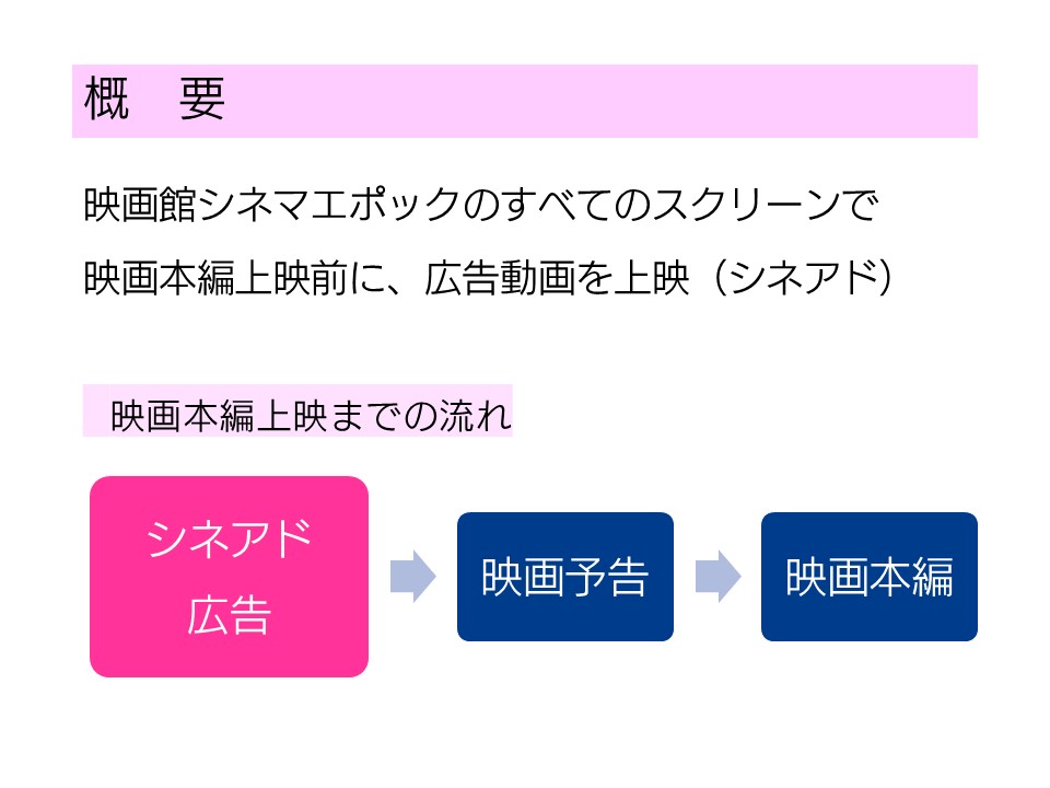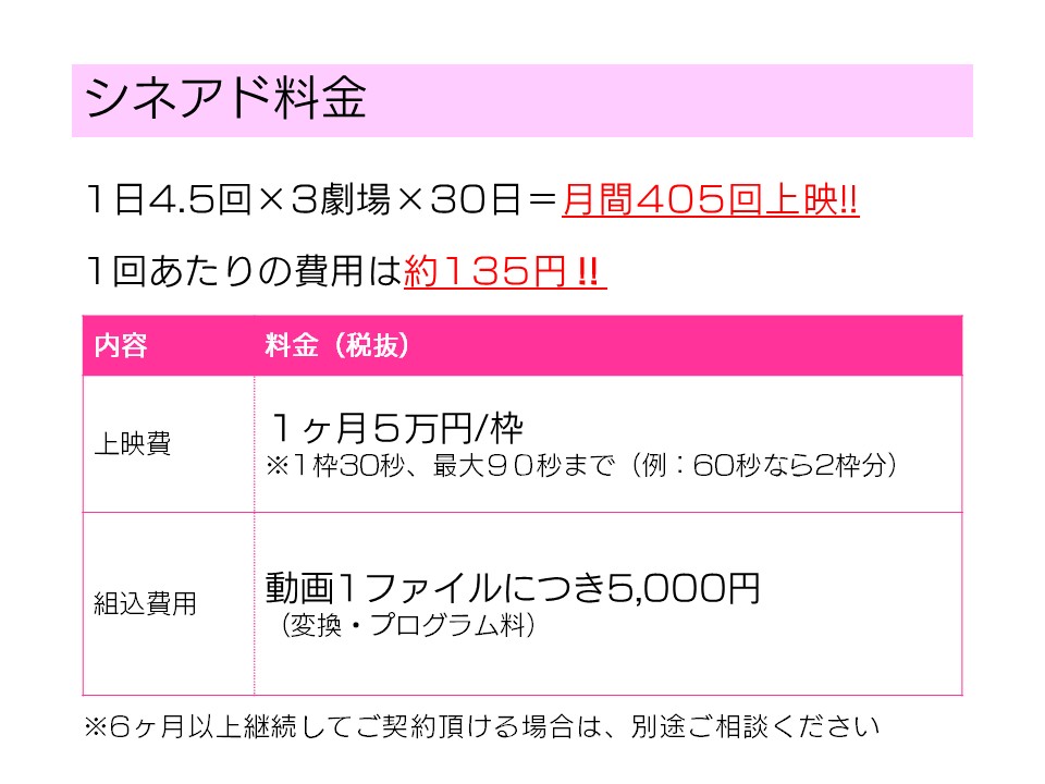 全スクリーン上映劇場は、その期間に上映されるすべての作品(特別興行除く)でシネアドが上映されます。