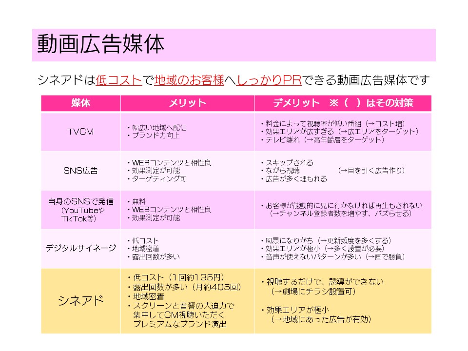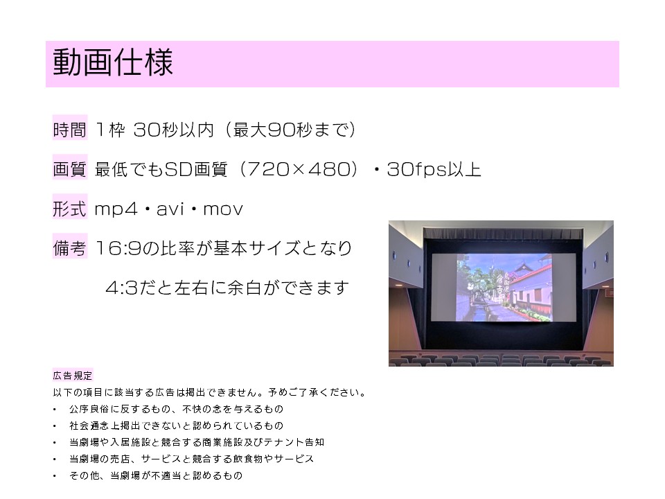 当劇場による広告主/商材/CM内容の考査があり、内容によって上映をお受けできない場合がございます。