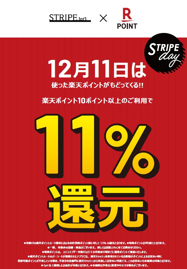 そして、12月11日はSTRIPDAY!楽天ポイント10ポイント以上のご利用で11%還元キャンペーンを実施しております。 いつものお買い物をさらにお得に買える大チャンス♪