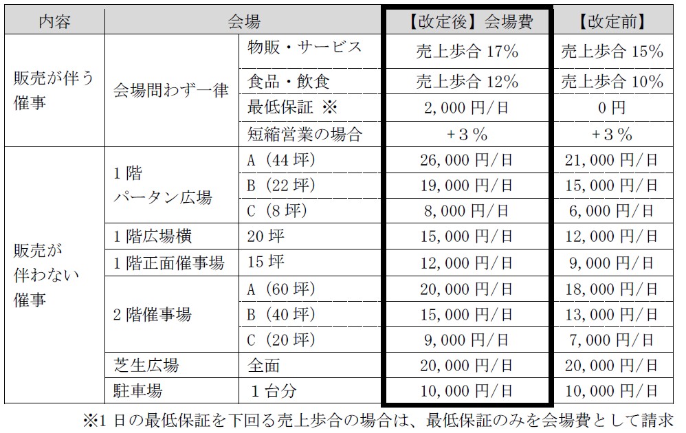 このたび、昨今の物価の高騰に伴い、現行の会場利用料金の維持が困難な状況となっております。つきましては、誠に心苦しい限りではございますが、下記のとおり催事会場の利用料金を改定させていただくこととなりました。